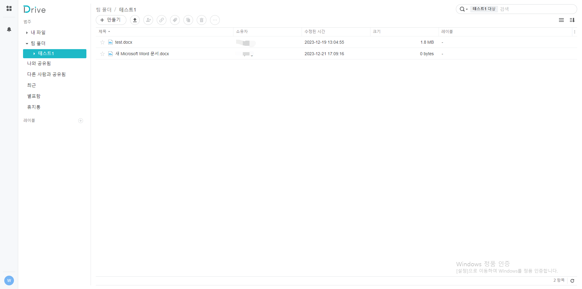실제로 시놀로지 오피스를 열어보면 이와 같이 시놀로지 드라이브가 열리는 것을 볼 수 있습니다. 해당 화면에서 다양한 작업들이 수행 가능합니다.
